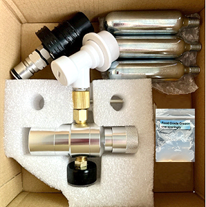 3-D printed adapter made of secure Food Grade PLA plastic, CO2 charger fitting with gas indicator, gas ball lock, three new 16g threaded cartridges, tube of food grade grease lube included, which provides better seals and easy assembly and disassembly.